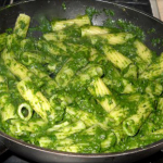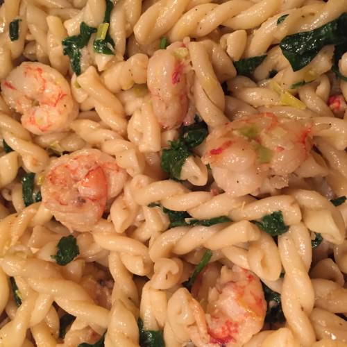 Pasta gamberetti, porro e spinaci